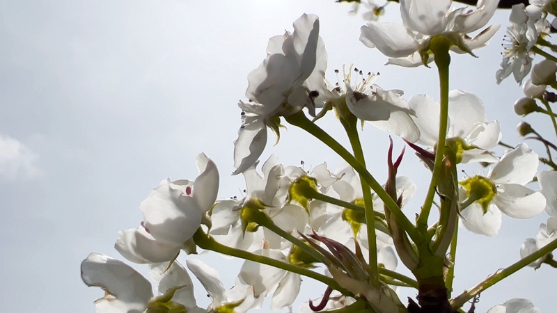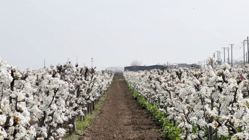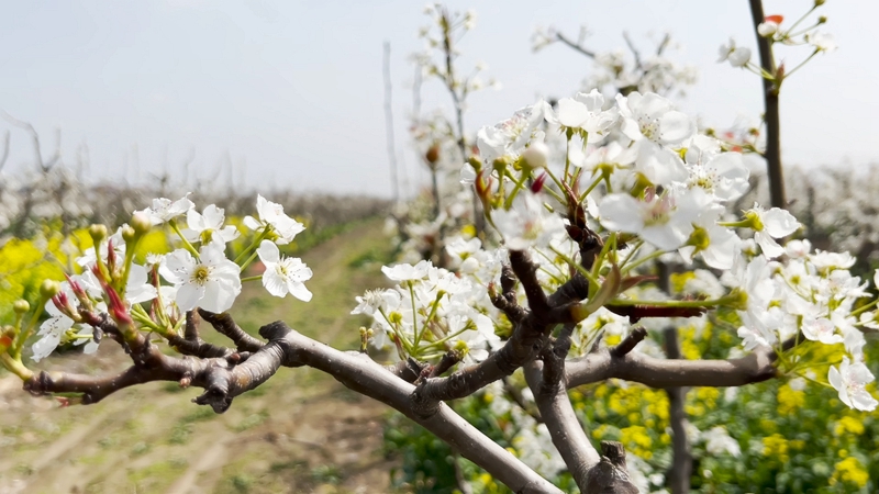 而1200畝的梨樹也等不及桃花的凋謝,一串串一簇簇潔白的梨花就迫不及待地在春風里綻放。白的花黃的蕊,在春風的撩撥下,跳躍著舞動著,潔白如雪,銀浪滾滾。據(jù)了解苗集鎮(zhèn)的前進村,多年前就以晚秋黃梨的種植出名,今年來根據(jù)市場的變化,把其中的1000畝梨樹嫁接改良品種,翠冠、青皮梨、紅啤梨、晚秋黃梨互相搭配,采摘期能從6月份持續(xù)到11月份。