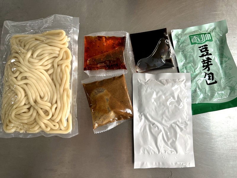 面條的原料選用的是北方的強筋面粉,加上活性谷朊粉,這樣就充分地保證了格拉條筋道的口感和食品的健康。加工和普通的格拉條店并沒有區(qū)別,真空和面機和面,醒面,壓制,水煮,唯一不同的就是煮好的格拉條要過4遍涼水,這樣才能把格拉條表面的浮面洗掉,使表面光滑,再噴入一些食用油,避免面條粘連。芝麻醬、調(diào)料包、榨菜、豆芽、辣椒油,面餅,6樣東西加上包裝,一碗帶著阜陽記憶的格拉條就可以發(fā)往全國各地了。