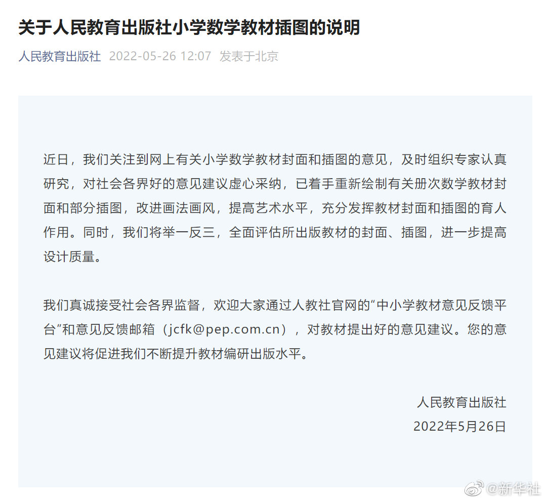 人民教育出版社微博發(fā)布《關(guān)于人民教育出版社小學(xué)數(shù)學(xué)教材插圖的說明》:近日,我們關(guān)注到網(wǎng)上有關(guān)小學(xué)數(shù)學(xué)教材封面和插圖的意見,及時組織專家認(rèn)真研究,對社會各界好的意見建議虛心采納,已著手重新繪制有關(guān)冊次數(shù)學(xué)教材封面和部分插圖,改進(jìn)畫法畫風(fēng),提高藝術(shù)水平,充分發(fā)揮教材封面和插圖的育人作用。同時,我們將舉一反三,全面評估所出版教材的封面、插圖,進(jìn)一步提高設(shè)計質(zhì)量。 我們真誠接受社會各界監(jiān)督,歡迎大家通過人教社官網(wǎng)的“中小學(xué)教材意見反饋平臺”和意見反饋郵箱(jcfk@pep.com.cn),對教材提出好的意見建議。您的意見建議將促進(jìn)我們不斷提升教材編研出版水平。