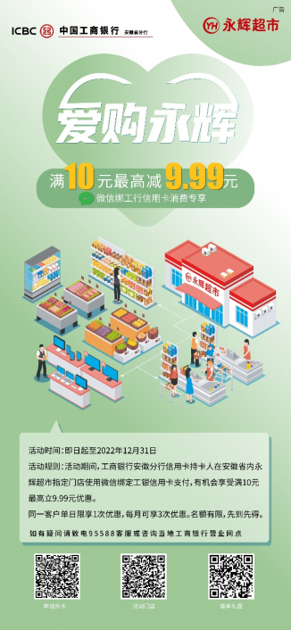 永輝超市 即日起至12月31日,工銀信用卡持卡人在永輝超市指定門店使用微信綁定工商銀行信用卡支付時,有機會可享受滿10元最高立減9.99元。