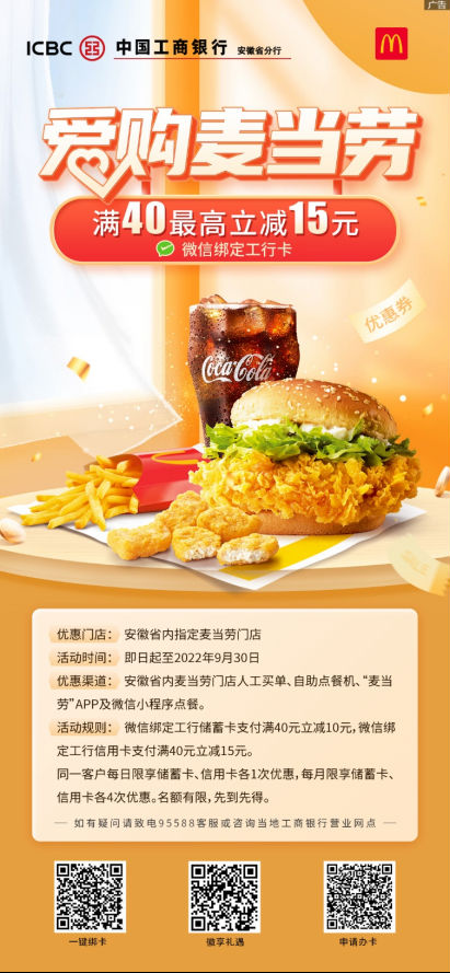 ![]() 愛購麥當勞 即日起至9月30日,工銀信用卡持卡人在麥當勞指定門店使用微信綁定工商銀行信用卡支付時,有機會可享受滿40元最高立減15元。使用微信綁定工行儲蓄卡支付時,有機會可享受滿40元最高立減10元。
