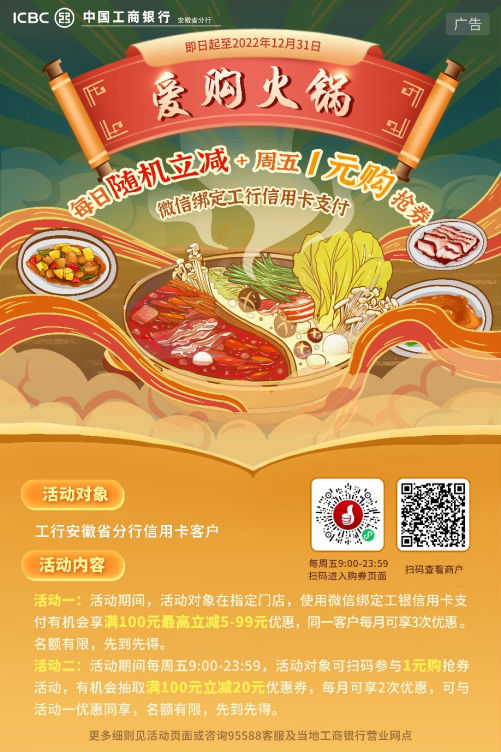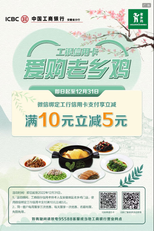 ![]() 愛購火鍋 即日起至12月31日,工銀信用卡持卡人在一棵蔥社區(qū)火鍋(河濱路店)、潁上川莊火鍋、界首王婆大蝦使用微信綁定工商銀行信用卡支付時,有機會可享受滿100元隨機立減5-99元。同時,活動期間每周五9:00-23:59,活動對象可掃碼參與1元購搶券活動,有機會抽取滿100元立減20元優(yōu)惠券,兩活動優(yōu)惠同時享用。 ![]() 愛購老鄉(xiāng)雞 即日起至12月31日,工銀信用卡持卡人在老鄉(xiāng)雞指定門店使用微信綁定工商銀行信用卡支付時,有機會可享受滿10元最高立減5元。