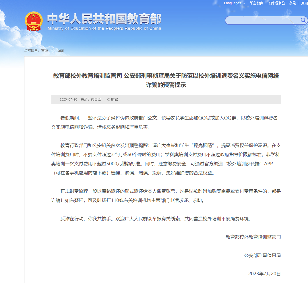 據教育部網站7月20日消息 教育部校外教育培訓監(jiān)管司、公安部刑事偵查局發(fā)布關于防范以校外培訓退費名義實施電信網絡詐騙的預警提示。 暑假期間,一些不法分子通過偽造政府部門公文,誘導家長學生添加QQ號或加入QQ群,以校外培訓退費名義實施電信網絡詐騙,造成惡劣影響和嚴重危害。 教育行政部門和公安機關多次發(fā)出預警提醒:請廣大家長和學生“擦亮眼睛”,提高消費權益保護意識。在支付培訓費用時,不要支付超過3個月或60個課時的費用;學科類培訓支付費用不超過政府指導價限額標準,非學科類培訓一次支付費用不超過5000元限額標準。同時,注意繳費安全,可通過官方渠道“校外培訓家長端”APP(可在各手機應用商店下載)選課、購課、消課、投訴,更好維護您的合法權益。 正規(guī)退費流程一般以原路返還的形式返還給本人繳費賬號,凡是退款時附加購買商品或支付費用條件的,都是詐騙!如有疑問,可及時撥打110或有關培訓機構主管部門電話求證、求助。 反詐在行動,你我共攜手。歡迎廣大人民群眾舉報有關線索,共同營造校外培訓平安消費環(huán)境。