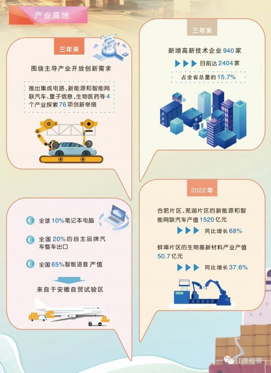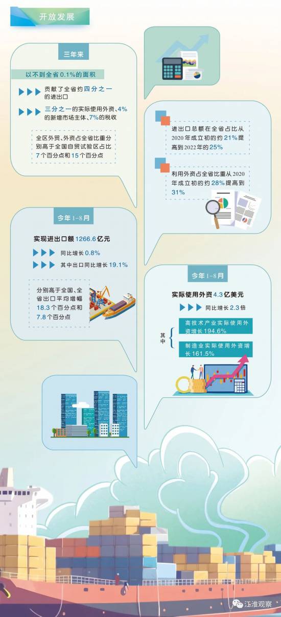 制圖:孫冠賢 三年來,安徽自貿(mào)試驗區(qū)開放高地效應(yīng)日益顯現(xiàn)。進出口總額在全省占比從2020年成立初的約21%提高到2022年的25%;利用外資占全省比重從2020年成立初的約28%提高到31%。境外世界500強德國大眾、美國康寧、法國圣戈班、渣打銀行等一批企業(yè)落戶安徽并持續(xù)擴大在皖投資。 賦予自由貿(mào)易試驗區(qū)更大改革自主權(quán),安徽正以推進自貿(mào)試驗區(qū)建設(shè)為重要抓手,推進制度創(chuàng)新,打造具有重要影響力的改革開放新高地。 當(dāng)一艘艘滿載皖產(chǎn)新能源汽車、太陽能電池的貨輪順江東去,駛?cè)胧澜缃?jīng)濟的大海。 為國家試制度 為安徽謀發(fā)展 制度創(chuàng)新是國家賦予自貿(mào)試驗區(qū)的核心任務(wù)。 僅在優(yōu)化營商環(huán)境領(lǐng)域,安徽自貿(mào)試驗區(qū)探索加快推進環(huán)評與排污許可“兩證合一”等改革,把項目審批周期壓縮到5個工作日;全國首創(chuàng)企業(yè)開辦涉稅業(yè)務(wù)“一網(wǎng)集成”,企業(yè)辦理相關(guān)業(yè)務(wù)僅需1.5小時……刀刃向內(nèi),優(yōu)化政府服務(wù),形成了一批在全省范圍內(nèi)推廣開來的改革舉措。 制度創(chuàng)新,不是對細(xì)枝末節(jié)的修剪,而是理清理順事物發(fā)展的內(nèi)在邏輯。 提升政務(wù)效能,縮短群眾辦事周期,其本質(zhì)就是著眼解決影響發(fā)展全局的深層次矛盾和問題,實現(xiàn)資源的優(yōu)化配置。要做到這一點,必須用更大力度、更大尺度來破舊立新。 為此,安徽于2021年建立自貿(mào)試驗區(qū)特別清單,賦予自貿(mào)試驗區(qū)省級行政權(quán)力、公共服務(wù)、中介服務(wù)便利化改革3類212項省級經(jīng)濟社會管理事項。今年2月,這份清單再次更新,調(diào)整為5類260項省級管理事項。用放權(quán)賦能,給予了自貿(mào)試驗區(qū)更大的改革自主權(quán),嘗試探索更多制度創(chuàng)新模式。