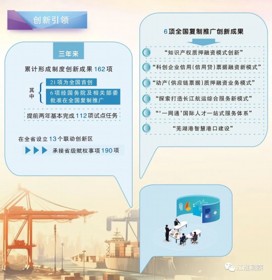 制圖:孫冠賢 科創(chuàng)企業(yè)信用(信用貸)票據(jù)融資新模式、動產(chǎn)(供應(yīng)鏈票據(jù))質(zhì)押融資業(yè)務(wù)模式、“一網(wǎng)通”國際人才一站式服務(wù)體系……省商務(wù)廳廳長、省自貿(mào)辦主任方旭介紹:“以大膽試、大膽闖、自主改的信心和勇氣,為國家試制度,為地方謀發(fā)展,三年來,安徽自貿(mào)試驗區(qū)累計形成制度創(chuàng)新成果162項,其中21項為全國首創(chuàng),6項經(jīng)國務(wù)院及相關(guān)部委批準(zhǔn)在全國復(fù)制推廣,7項入選商務(wù)部研究院《中國自由貿(mào)易試驗區(qū)發(fā)展報告(2023)》創(chuàng)新案例,提前兩年基本完成112項試點任務(wù)?!?/p> 2021年3月,安徽試點開展“證照分離”改革。作為“試驗田”,安徽自貿(mào)試驗區(qū)加大了改革力度,在528項審批制度改革的基礎(chǔ)上增加試點,直接取消審批14項,審批改為備案15項,實行告知承諾25項,更大程度釋放改革紅利。 “我欲乘風(fēng)去,擊楫誓中流?!弊鳛楦母镩_放試驗田,安徽自貿(mào)試驗區(qū)責(zé)任在肩,擔(dān)當(dāng)于行。 全域協(xié)同聯(lián)動 制度創(chuàng)新惠及更廣 自貿(mào)試驗區(qū)建設(shè),要種苗圃,不是做盆景。可復(fù)制可推廣,是檢驗創(chuàng)新成果的重要標(biāo)準(zhǔn)。 2021年,上海海關(guān)與合肥海關(guān)攜手,探索將蕪湖港作為洋山港的貨物接卸地。簡單來說,就是把蕪湖港作為上海港的延伸,出口貨物在蕪湖港進行一次報關(guān),降低境內(nèi)物流成本?!奥?lián)動接卸,視同一港”整體監(jiān)管模式下,可省去轉(zhuǎn)關(guān)申報和二次運抵等通關(guān)手續(xù),平均壓縮50%轉(zhuǎn)駁運輸時間、30%物流成本?!?021年我們推出‘聯(lián)動接卸’監(jiān)管模式以來,已應(yīng)用該模式保障約20億元皖產(chǎn)汽車揚帆出海。”蕪湖海關(guān)有關(guān)負(fù)責(zé)人介紹。 如今,“聯(lián)動接卸”監(jiān)管模式在全省一類水運口岸全面鋪開,大大提升了安徽跨境貿(mào)易便利化水平。