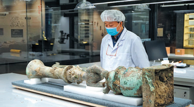 | 文物修復(fù) 四川省文物考古研究院三星堆遺址工作站站長(zhǎng)雷雨在查看拼對(duì)成功的鳥(niǎo)足曲身頂尊神像。 新華社記者 肖 林?jǐn)z |