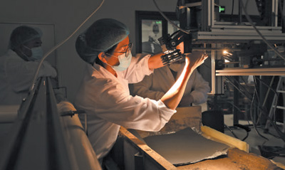 | 數(shù)字采集 考古人員在實(shí)驗(yàn)室,對(duì)三星堆出土文物進(jìn)行高光譜掃描。 廣漢市委宣傳部供圖 |