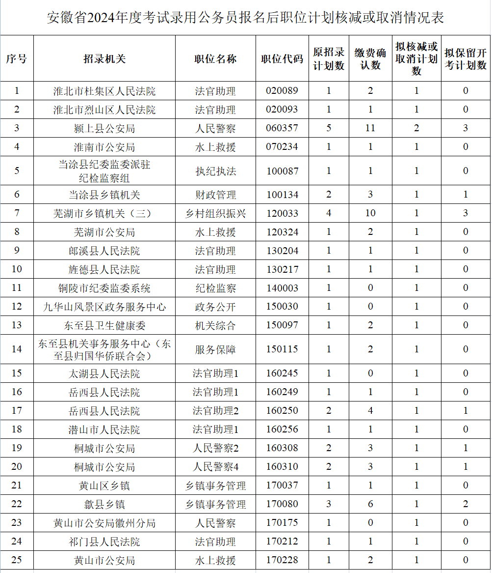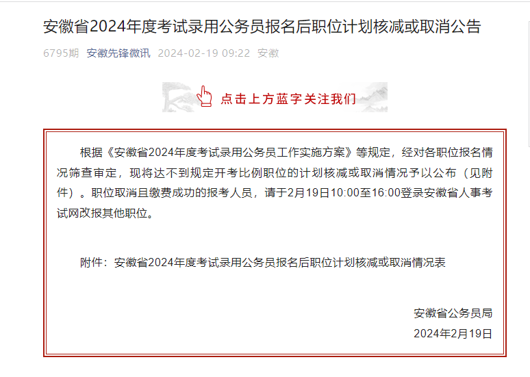 大皖新聞?dòng)?/strong> 據(jù)安徽先鋒微訊消息 2月19日,安徽省公務(wù)員局發(fā)布《安徽省2024年度考試錄用公務(wù)員報(bào)名后職位計(jì)劃核減或取消公告》。