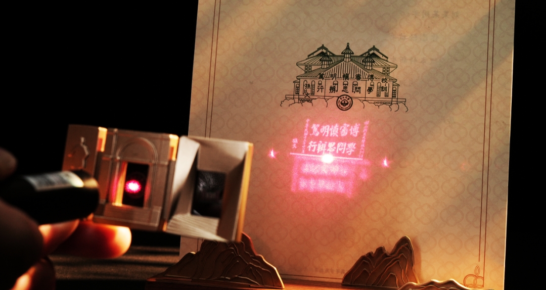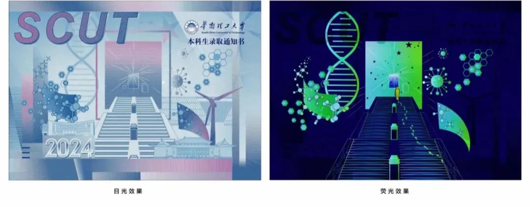 同時,如果用紫光燈照射,錄取通知書背面將華麗變身為“知識殿堂”“未來之門”,沿百步梯而上,兩側(cè)熒光炫麗、星光燦爛,體現(xiàn)“百步之上 伸手摘星”創(chuàng)作主題。