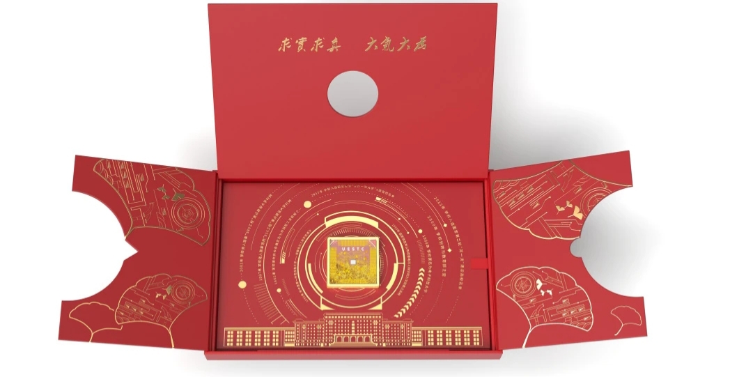 攜學(xué)子赤誠之心,鑄強國科技之芯。電子科技大學(xué)的錄取通知書禮盒封面是日晷機關(guān),開啟后將看到“成電銀杏葉芯片”, 嵌入中間的是5mm見方的“硅芯片”,每一顆都源自集成電路科學(xué)與工程學(xué)院(示范性微電子學(xué)院)師兄師姐們親手制備的芯片,芯片配合銀杏流沙在周圍流動,展現(xiàn)專屬浪漫。