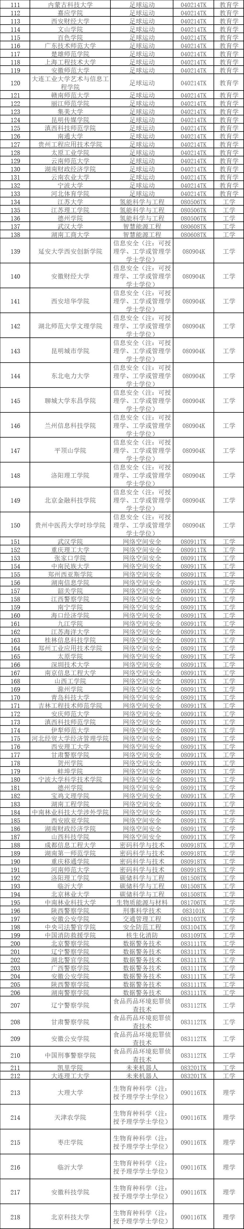 人民網(wǎng)北京9月13日電 (記者李依環(huán))教育部網(wǎng)站近日發(fā)布《2024年度普通高等學(xué)校本科專(zhuān)業(yè)申報(bào)材料公示》,根據(jù)公示統(tǒng)計(jì),2024年度擬新增專(zhuān)業(yè)535個(gè),涉及353所高校。 從申報(bào)的專(zhuān)業(yè)類(lèi)型來(lái)看,2024年度共申報(bào)176種專(zhuān)業(yè)。其中,申報(bào)數(shù)量前五名的專(zhuān)業(yè)依次為:足球運(yùn)動(dòng)(39個(gè))、網(wǎng)絡(luò)空間安全(37個(gè))、運(yùn)動(dòng)訓(xùn)練(34 個(gè))、健康與醫(yī)療保障(17個(gè))、老年醫(yī)學(xué)與健康(14個(gè))。