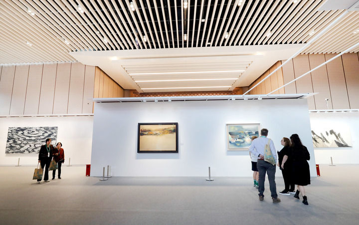 ??11月9日,觀眾在第七屆進博會國際現(xiàn)當代藝術專區(qū)觀看繪畫藝術展品。新華社記者 方喆 攝 ??進博會期間,200余場中外文藝表演精彩紛呈,既有河南的戲曲、新疆的舞蹈、浙江的皮影戲等中國傳統(tǒng)藝術表演,也有來自克羅地亞、意大利、法國等國外藝術家的精彩演繹,令人大飽眼福。