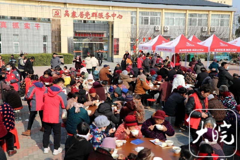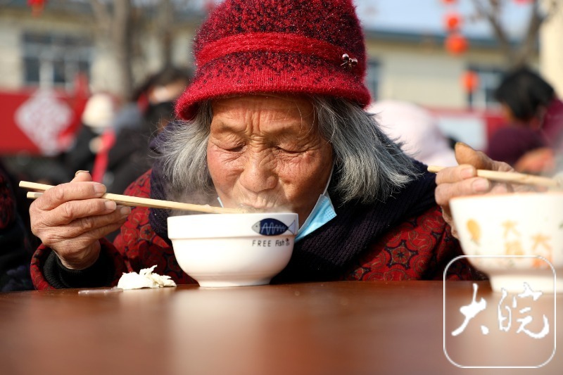 當(dāng)天,阜陽市潁東區(qū)正午鎮(zhèn)吳寨居委會文化廣場,擺了20桌大席,村民們高興地吃著餃子,喝著熱氣騰騰的羊肉湯。
