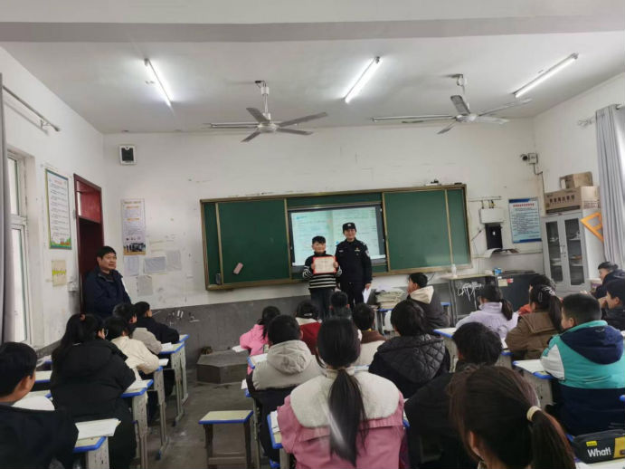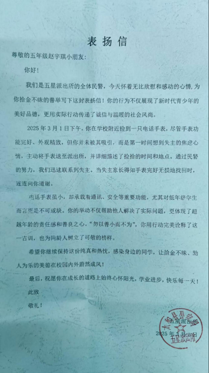 “今天我們來到這里,是為了對趙宇琪同學(xué)拾金不昧的精神進行表彰。希望各位同學(xué)都能向他學(xué)習(xí),心懷正義,弘揚社會正能量,爭做新時代好少年?!?月3日下午,五星派出所民警帶著表揚信和榮譽證書來到五星鎮(zhèn)中心學(xué)校,為該校學(xué)生趙宇琪舉辦了一場特別的“表彰儀式”。