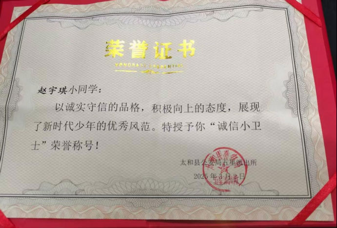 | 拾金不昧好少年 德育馨香滿校園 ——太和縣五星鎮(zhèn)中心學(xué)校趙宇琪同學(xué)獲“誠信小衛(wèi)士”表彰 |